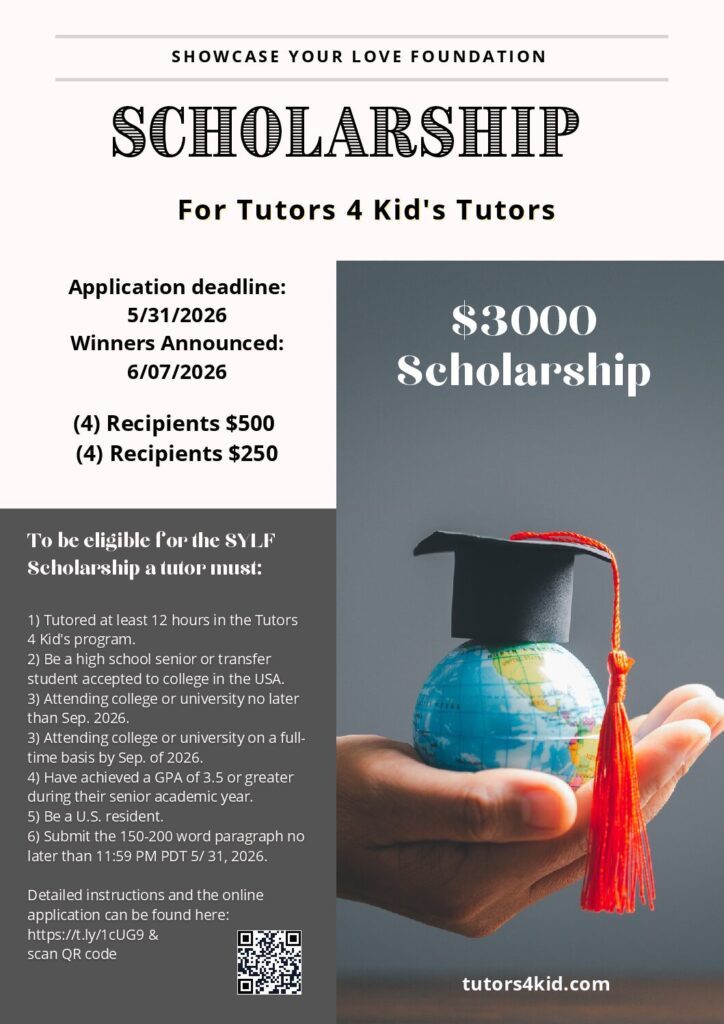 The Showcase Your Love Foundation (SYLF) Scholarship for our dedicated tutors! This opportunity is open to high school seniors or transfer students who are preparing to start college full-time in the United States by September 2026. We are awarding a total of $3000, with four recipients receiving $500 each and another four receiving $250 each.+3